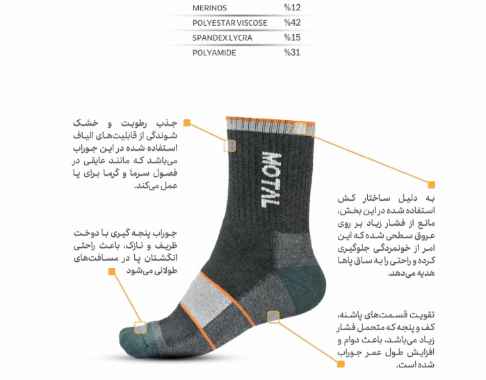 - جذب رطوبت و خشک شوندگی از قابلیتهای الیاف استفاده شده در این جوراب میباشد که مانند عایقی در فصول سرما و گرما برای پا عمل میکند.